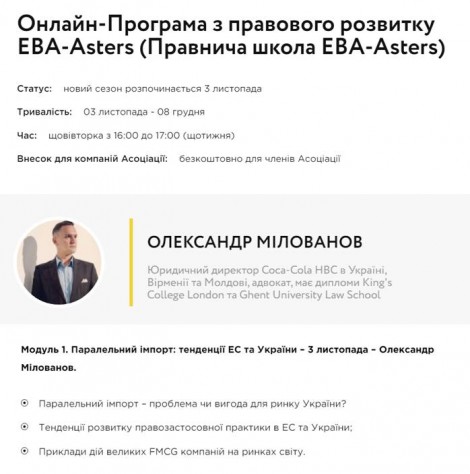 Лекція Олександра Мілованова (юридичного директора компанії Coca-Cola HBC в Україні, Вірменії та Молдові) у Правничій школі ЕВА-Астерс 3 листопада 2020 р.