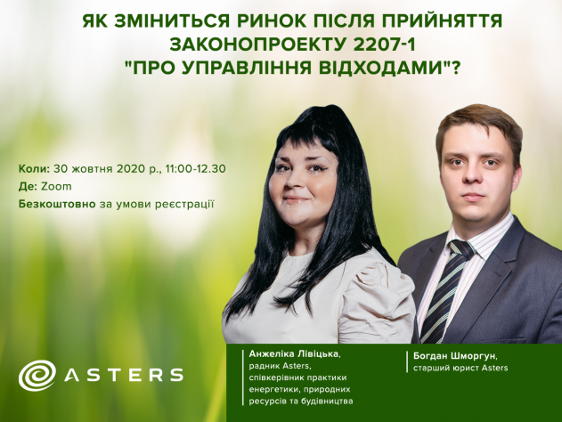 Експерти Астерс запрошують на вебінар "Як зміниться ринок після прийняття Законопроекту 2207-1 "Про управління відходами"?, який відбудеться 30 жовтня з 11.00 до 12.30.